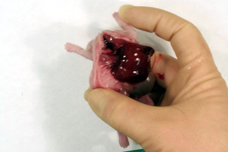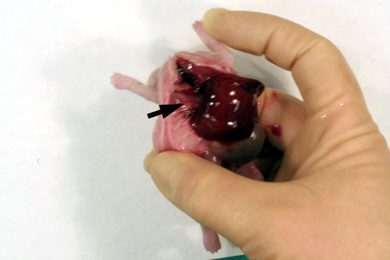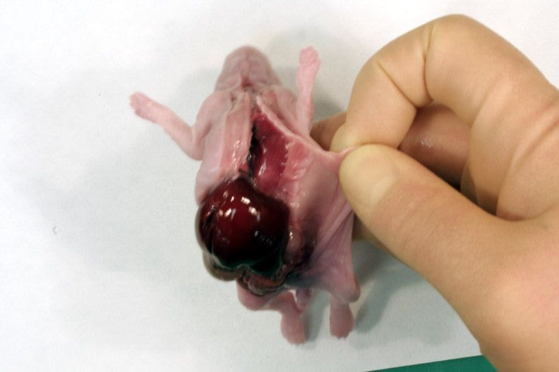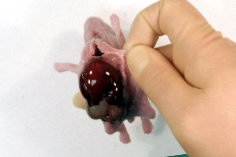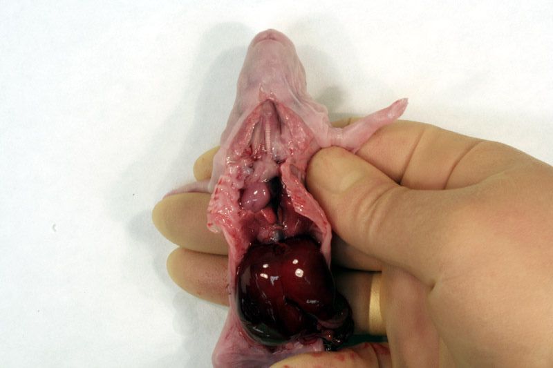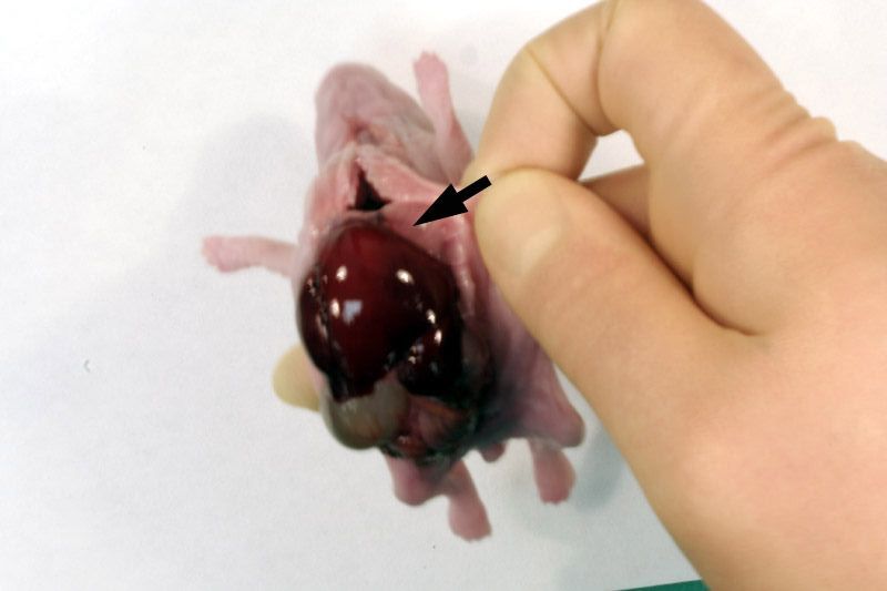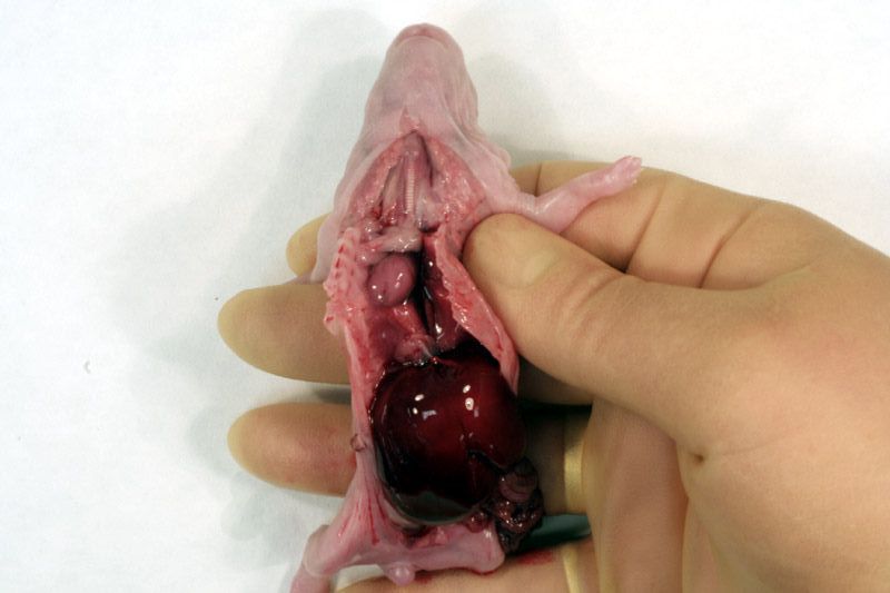 Following examination of the external surface of the fetus, a midline incision, avoiding the sternum, should be made from the genital papilla to underneath the lower jaw partially exposing tissues in the neck, thorax and abdomen. Following examination of the diaphragm (arrows below) this structure should be cut to facilitate further examination of the contents of the thoracic cavity. Thoracic organs exposed. Careful dissection (blunt and sharp) should be used, together with gravity to expose and move tissues during the examination process. Blood vessels should be traced and their patency assessed. The internal structure of the heart and kidneys should be examined. The intestine should be checked for areas of constriction and blockage. The sex of the fetus should be assessed by direct examination of the gonads.