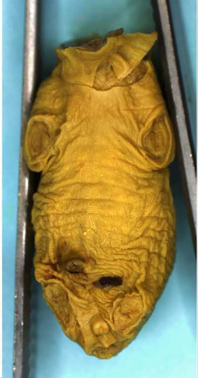 Unskinned rat fetuses are fixed whole in Bouin's fluid and examined externally before being decapitated prior to head sectioning and microdissection. The limbs and tail may also be removed, if desired, as illustrated below to facilitate grip and manipulation by the examiner.