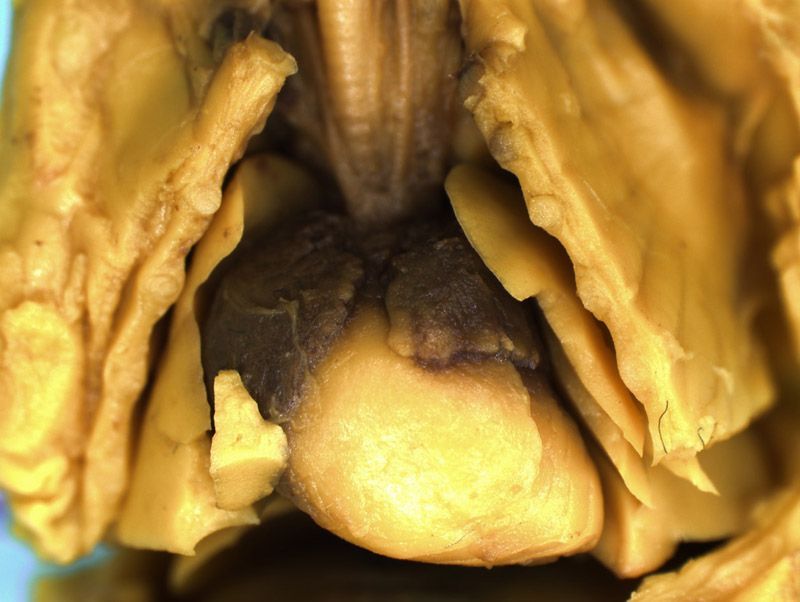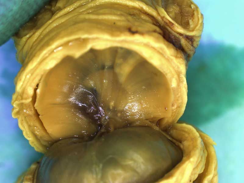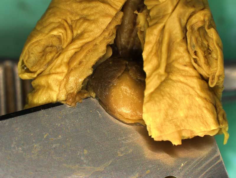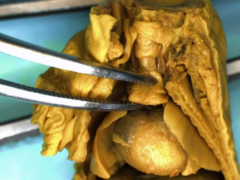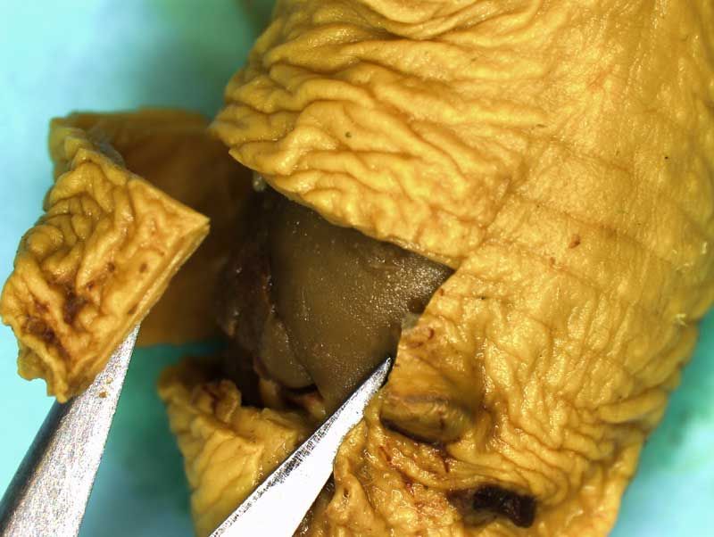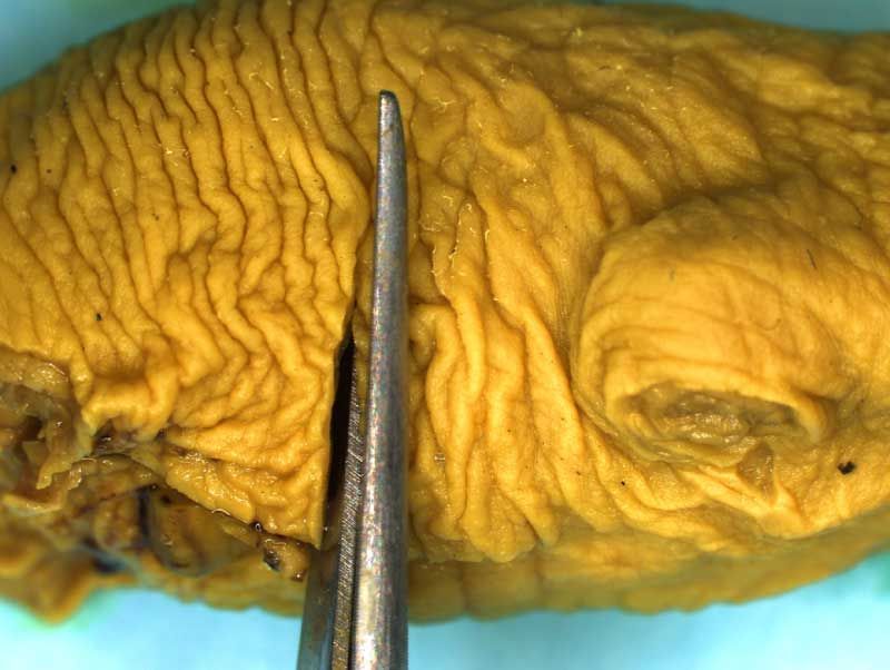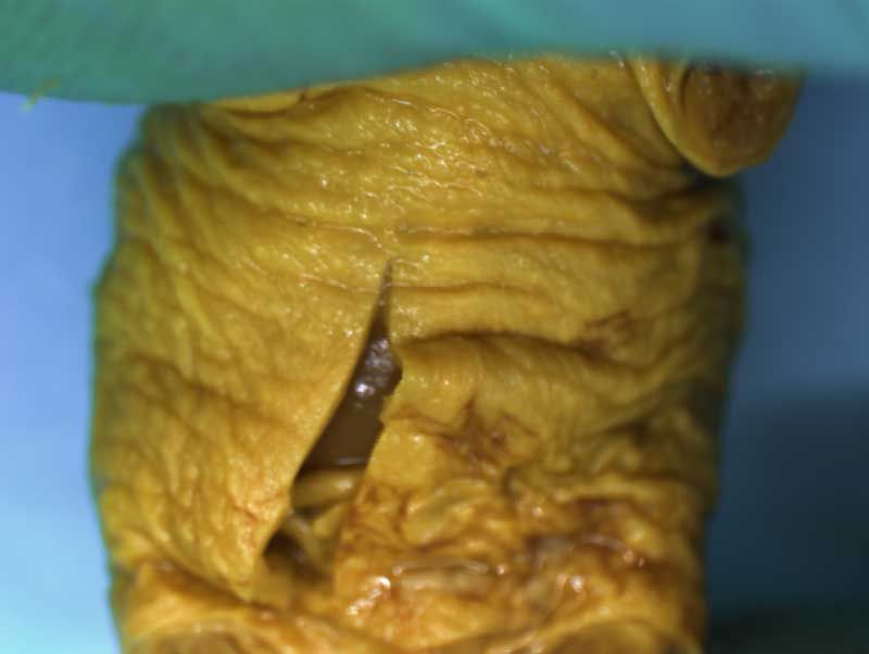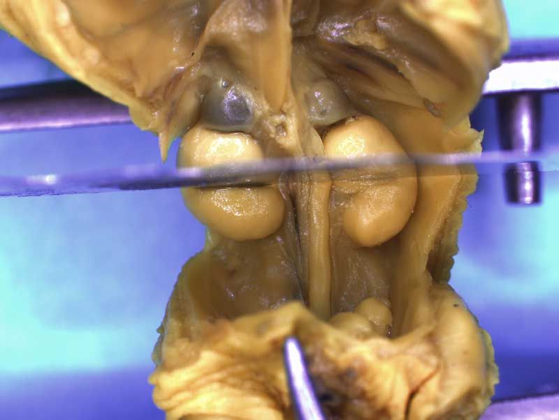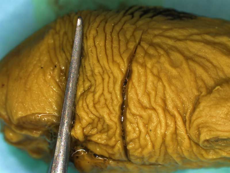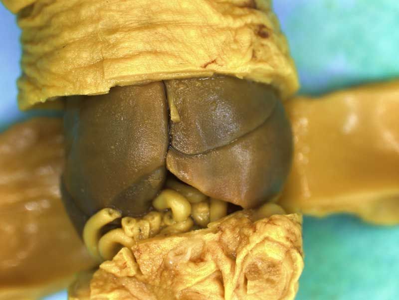 Incisions should be made to expose the contents of the abdomen. Following examination of the diaphragm another incision is made to facilitate examination of the contents of the neck and thoracic cavity. Careful dissection (blunt and sharp) should be used to expose and move tissues during the examination process. Blood vessels should be traced and their patency assessed. The internal structure of the heart and kidneys should be examined. The intestine should be checked for areas of constriction and blockage. The sex of the fetus should be assessed by examination of the gonads and should confirm that, which was determined externally.