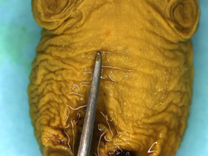 Any procedure using Bouin's fluid should be performed in a well ventilated area. For the examination of head sections, low-power magnification is recommended. A good light source is also essential with the specimen being illuminated from above. The setup pictured below demonstrates illumination from above using the flexible necks of a cold light source.